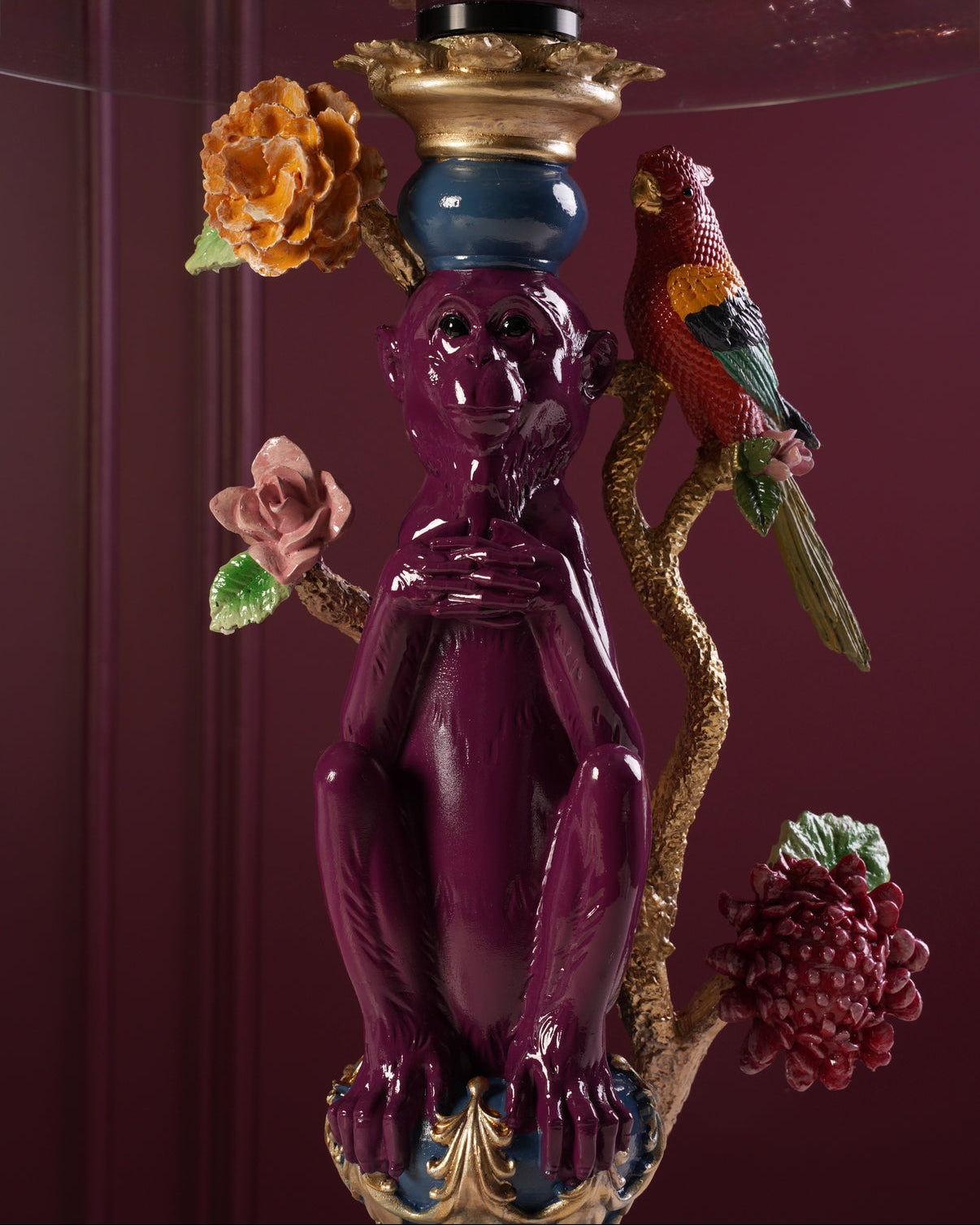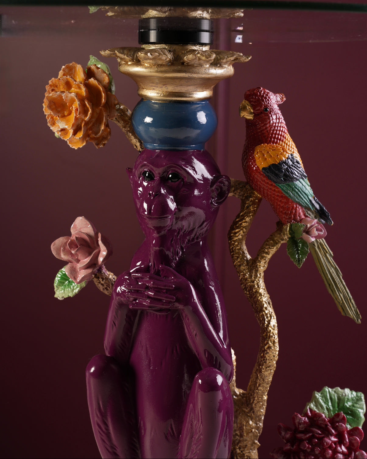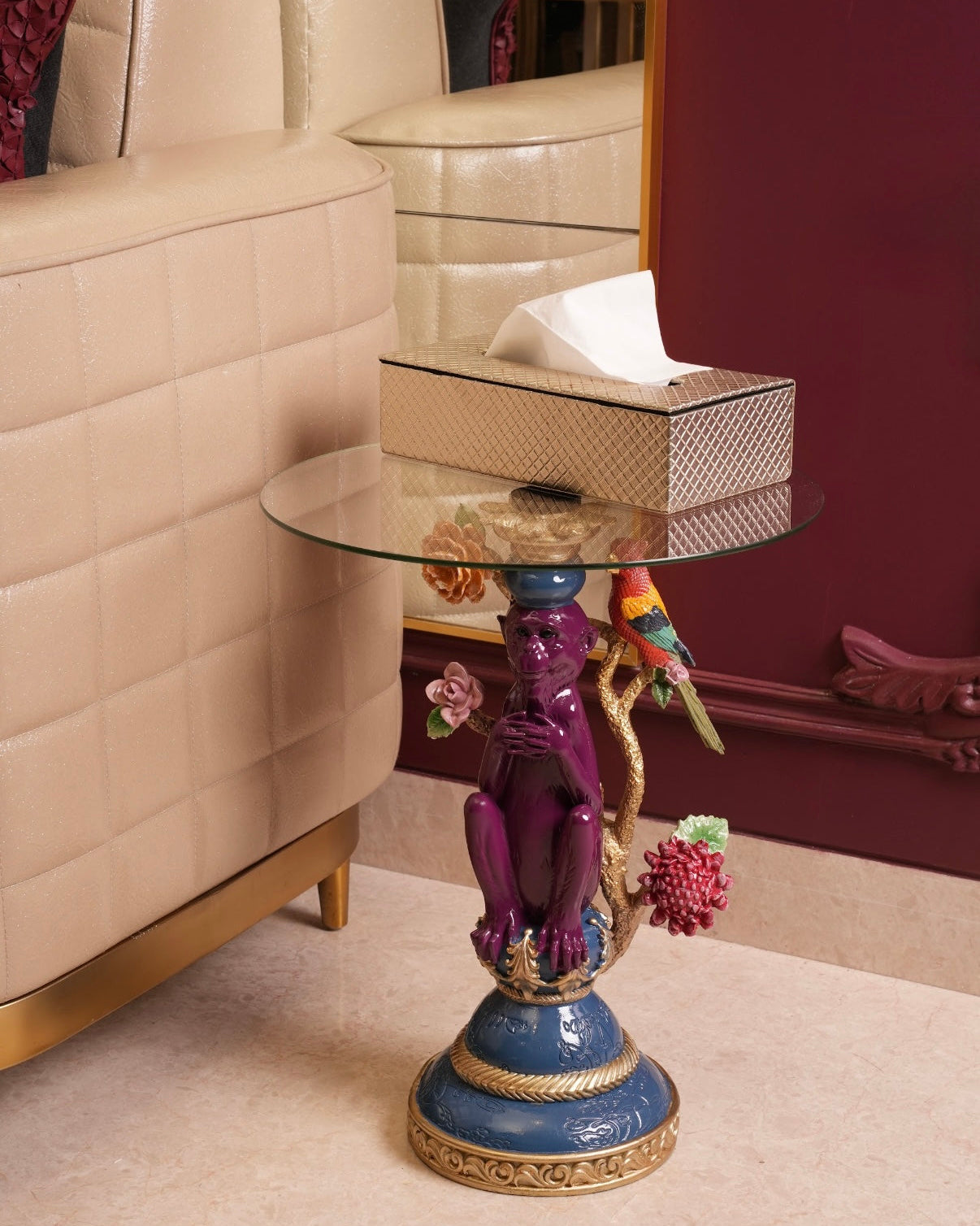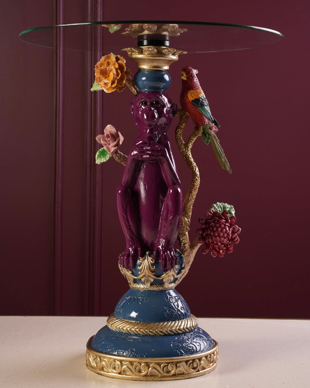 Our exotic garden side table blends bold colours with ornate detailing, finished with a clear glass top. A striking statement piece for art-loving interiors.