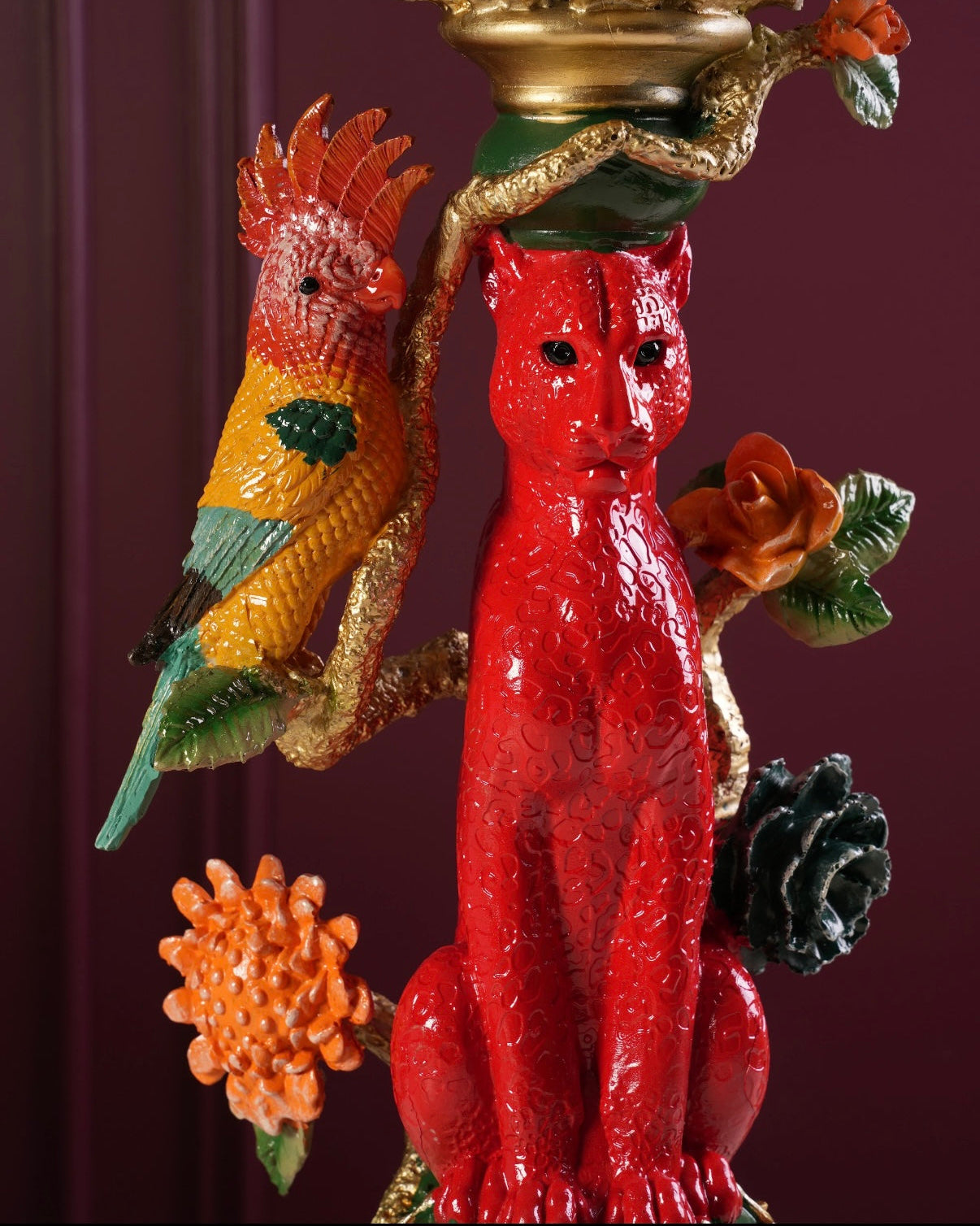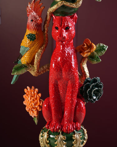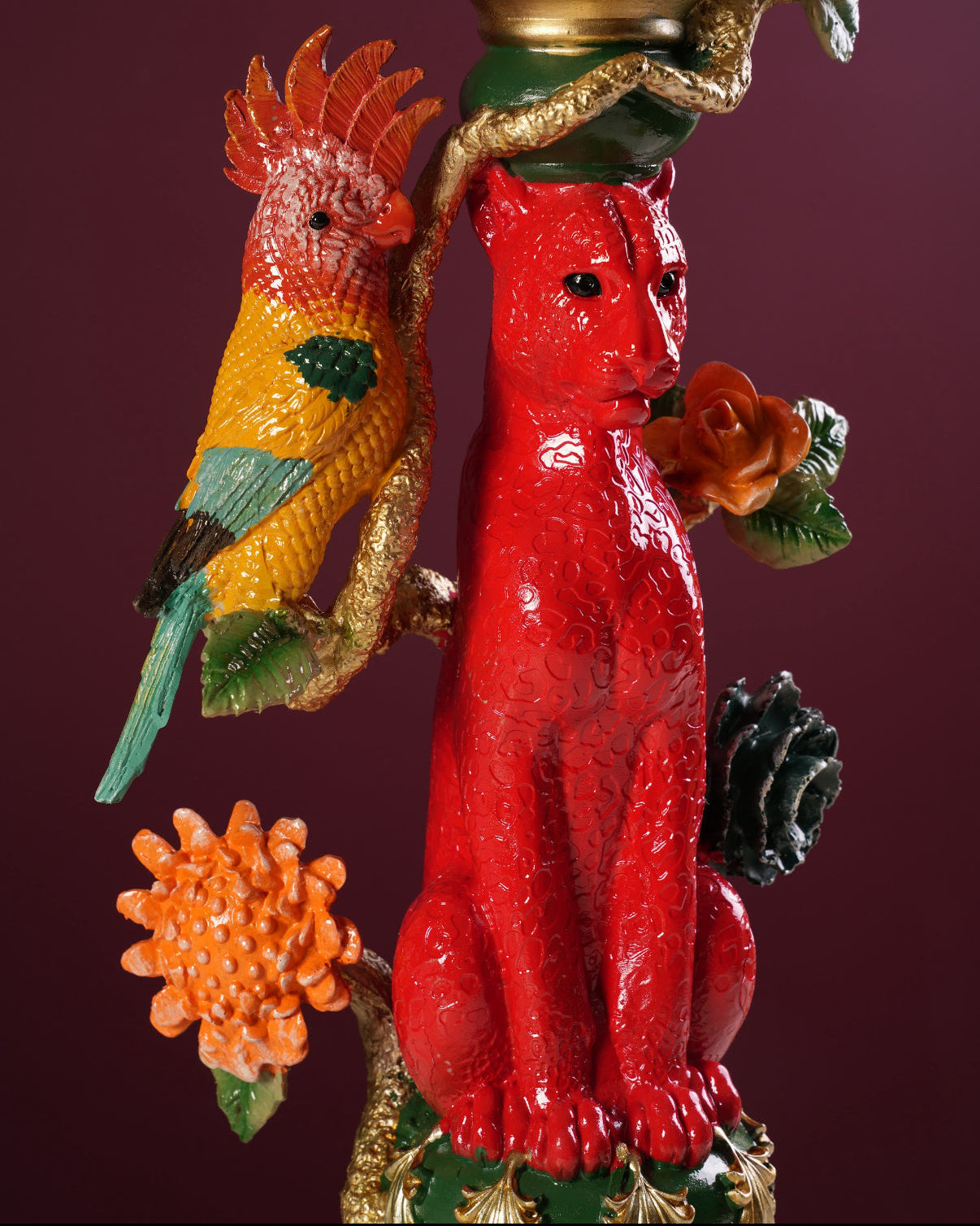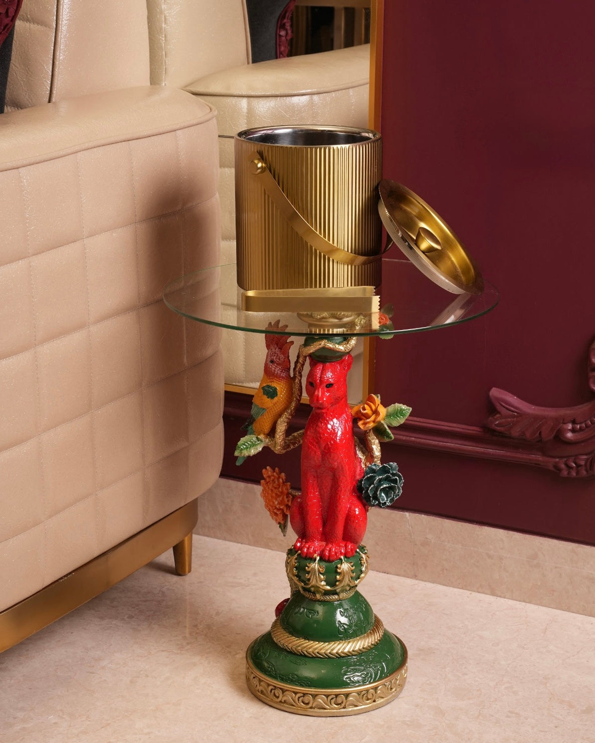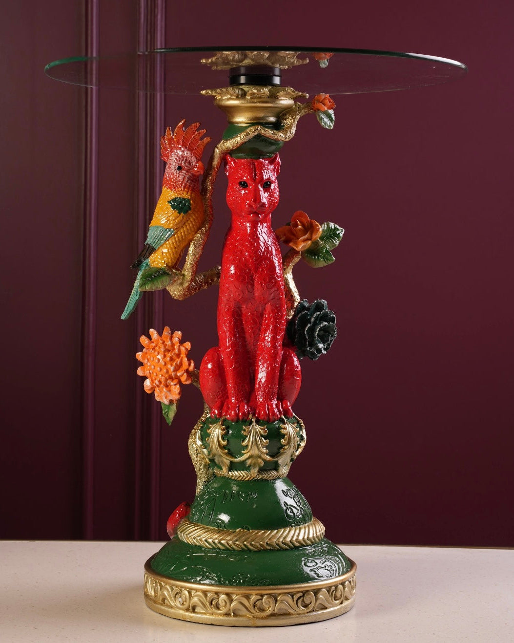 Our exotic garden side table blends bold colours with ornate detailing, finished with a clear glass top. A striking statement piece for art-loving interiors.
